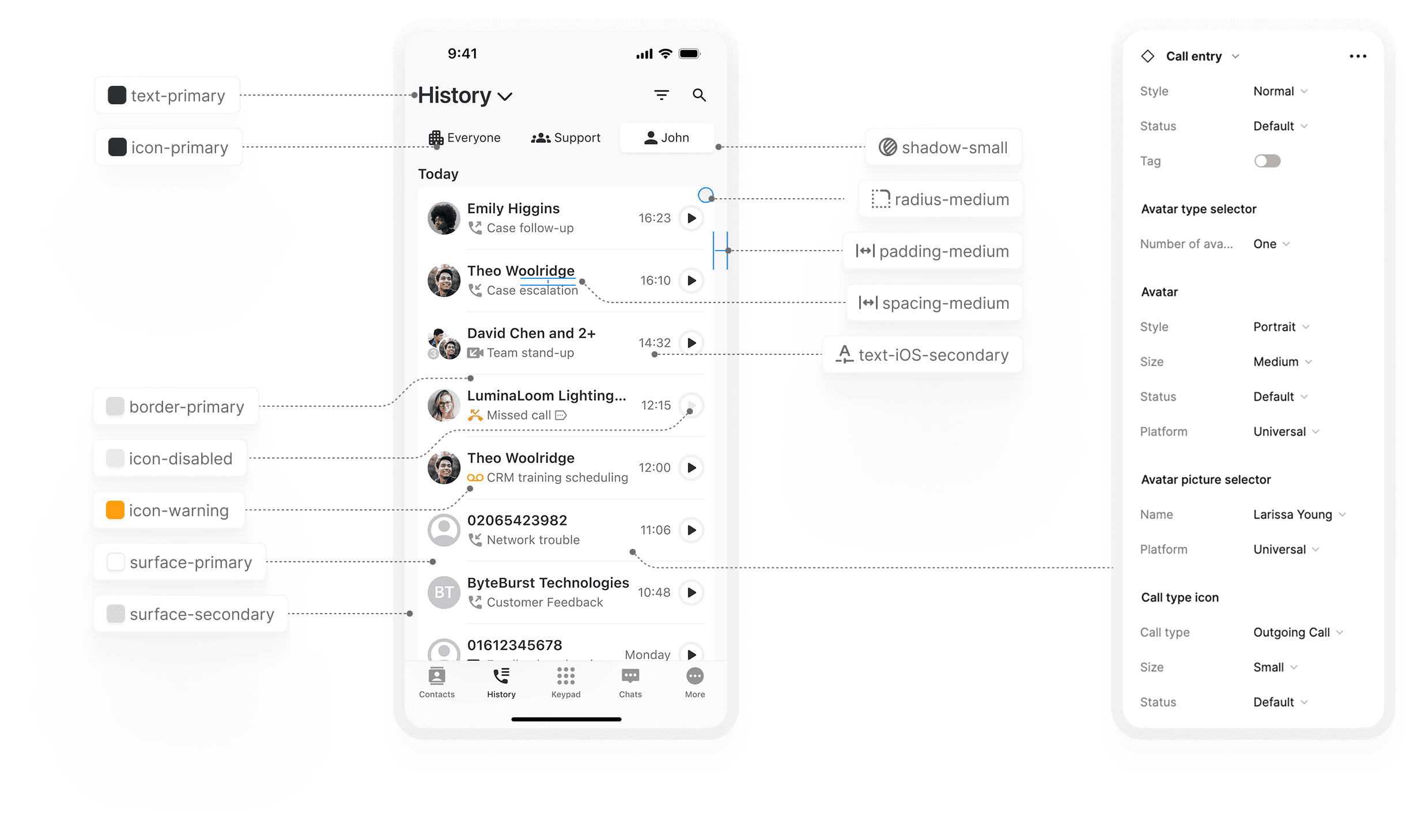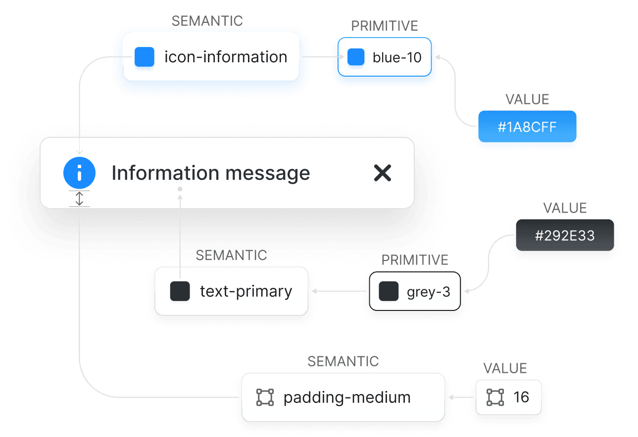 The example below demonstrates how design tokens maintain visual consistency across platforms. Communication products often feature high-reuse UI elements, but with multiple states and variations. By integrating these variations into parameterised components, we enabled a more flexible and efficient design system.