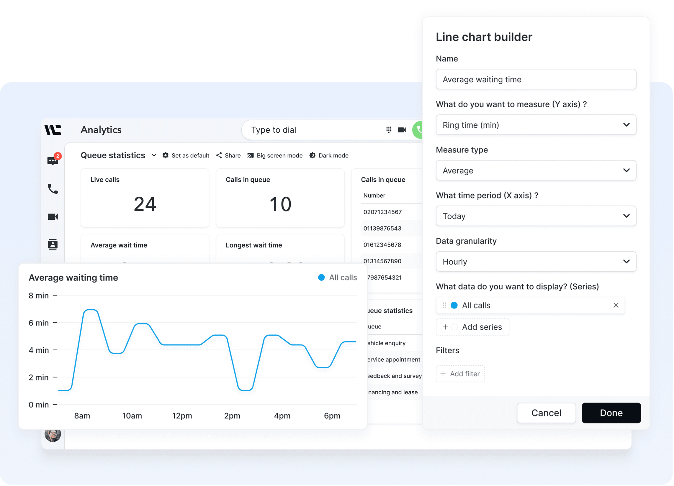 The new analytics dashboard gives users greater flexibility and control. I designed an open-ended system offering a range of key metrics and visualisation options, allowing users to build custom dashboards tailored to their needs—empowering them to monitor and optimise call routing effectively.